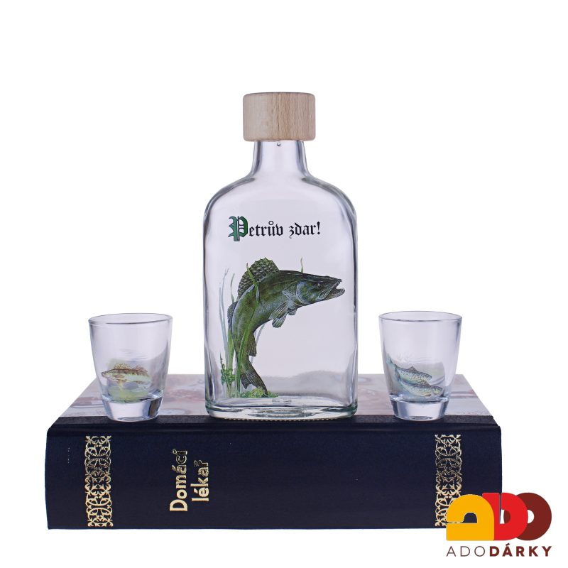 Sada dvou odlivek s obrázkem ryb a jedné láhve s nápisem "Petrův zdar" je dárkově luxusně zabalena jako kniha s nápisem Domácí lékař. Nápaditý dárek především pro rybáře k jakémukoliv výročí nebo narozeninám. Už je na každém člověku, kam si ho schová nebo uloží, jestli do knihovny mezi knihy nebo někam do dílny na poličku...
