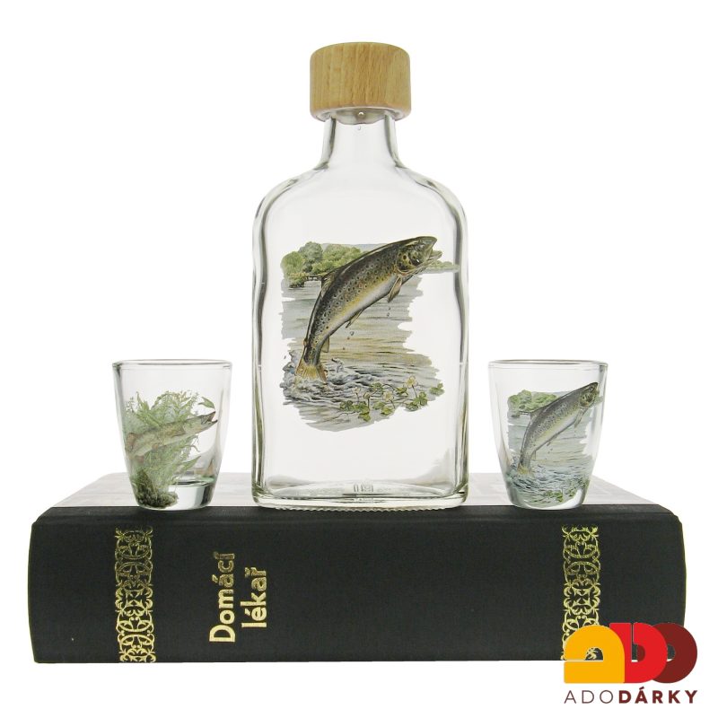 Sada dvou odlivek s obrázkem ryb a jedné láhve je dárkově luxusně zabalena jako kniha s nápisem Domácí lékař. Nápaditý dárek především pro rybáře k jakémukoliv výročí nebo narozeninám. Už je na každém člověku, kam si ho schová nebo uloží, jestli do knihovny mezi knihy nebo někam do dílny...