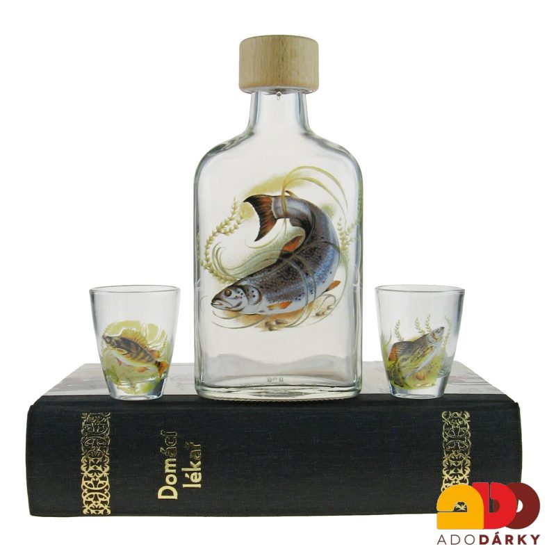 Sada dvou odlivek s obrázkem ryb a jedné láhve je dárkově luxusně zabalena jako kniha s nápisem Domácí lékař. Nápaditý dárek především pro rybáře k jakémukoliv výročí nebo narozeninám. Už je na každém člověku, kam si ho schová nebo uloží, jestli do knihovny mezi knihy nebo někam do dílny na poličku...