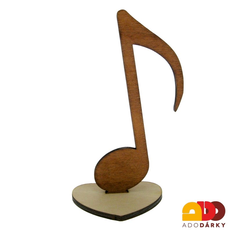 V Česku vyrobená dřevěná figurka ve tvaru noty. Nota je umístěna na bílém podstavci ve tvaru srdíčka.