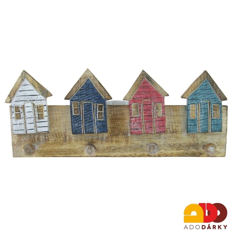 Dřevěný věšák na zeď s barevnými domečky - 4 věšáky 41 cm