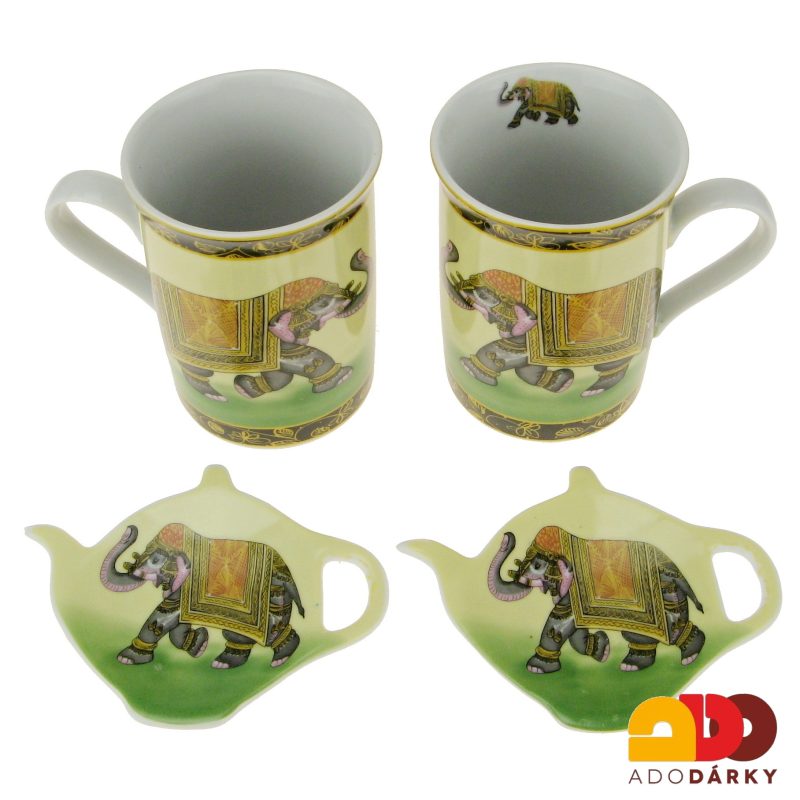 Dva porcelánové hrnky v dárkové krabici s polu s odkladacími "podšálečky" na čajové sáčky.V še je v jednom dekoru a to obrázků indických slonů.