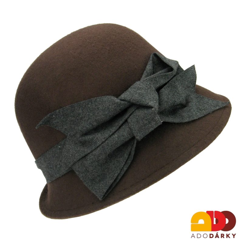 - Hnědý plstěný klobouk s dvojitou mašlí