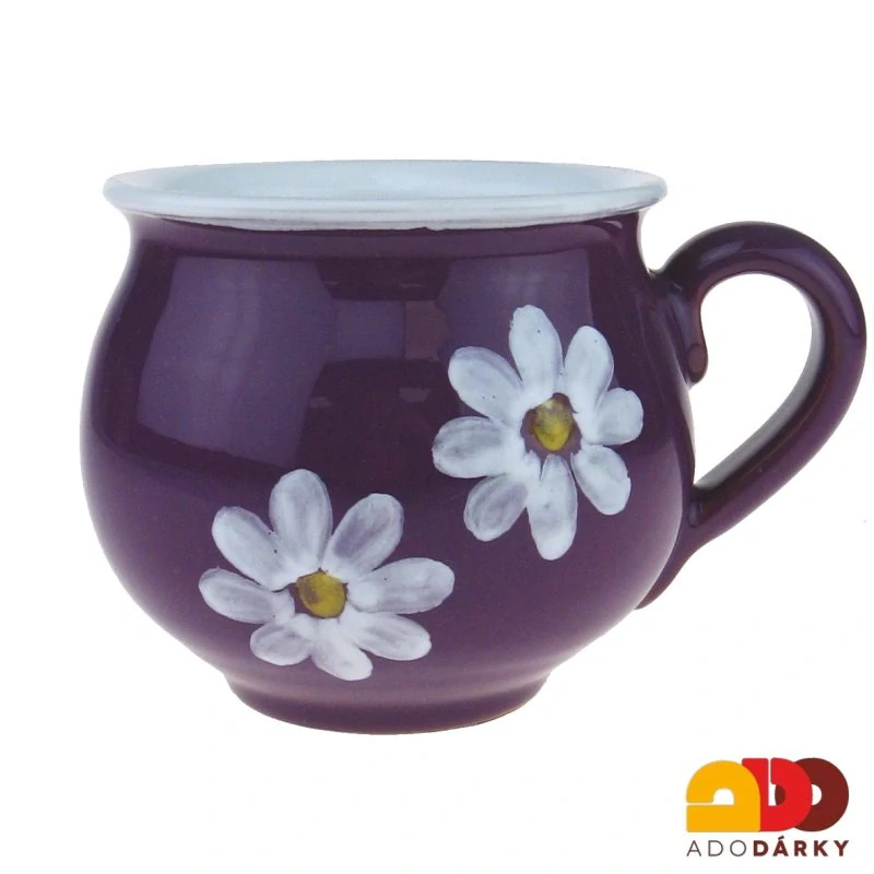 Tradiční fialový keramický hrneček, zdobený dvěma velkými malovanými kytičkami na jedné straně. Udělejte radost sobě nebo svým blízkým a pořiďte tento retro hrneček v různých barvách a velikostech. Záleží jen na Vašem vkusu.