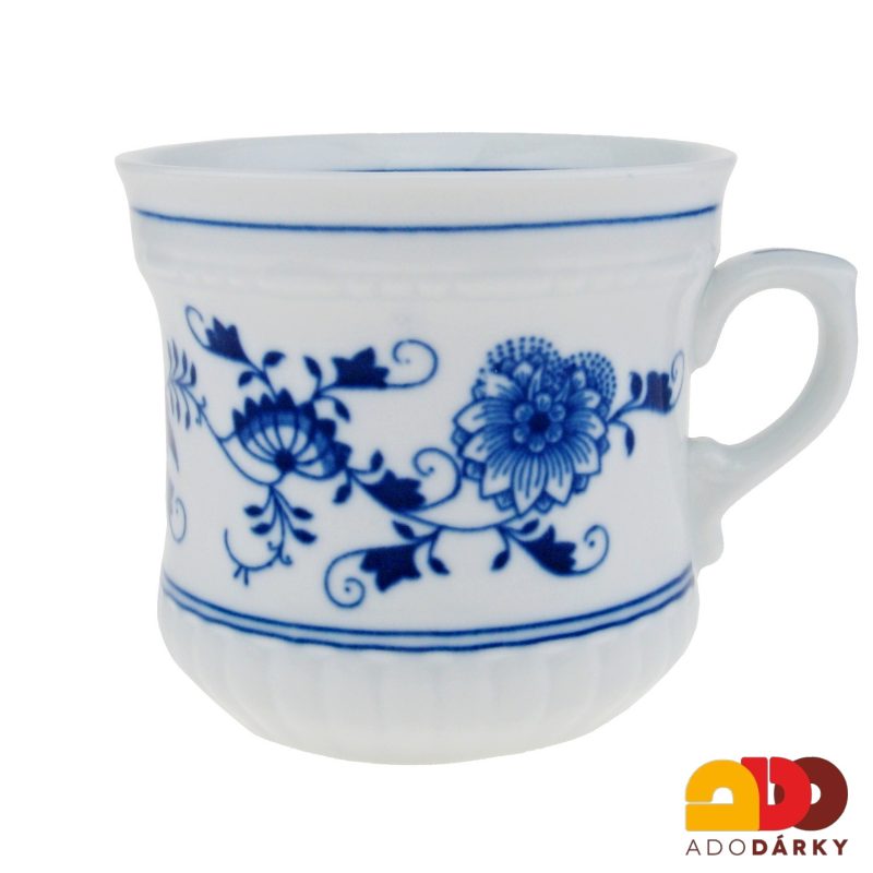 Hrneček z bílého porcelánu, dekorovaný slavným cibulovým vzorem. Produkt je té nejvyšší kvality a hodí se nejen k dekoraci, ale i k plnohodnotnému využívání. Porcelán je vyráběn českou porcelánkou Original Bohemia Zwiebelmuster z Dubí, kde probíhá výroba porcelánu již od roku 1885.