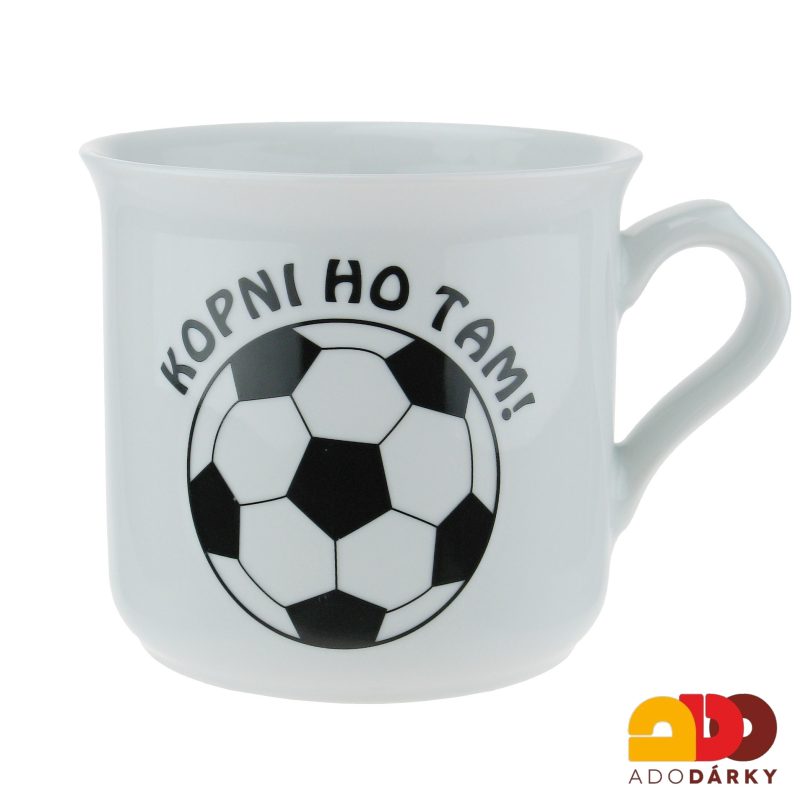 Bílý porcelánový hrnek zdobený fotbalovým míčem a nápisem Kopni ho tam. Jako dárek se nejlépe hodí pro fanoušky kulatého nesmyslu, ale samozřejmě nejen pro ně...