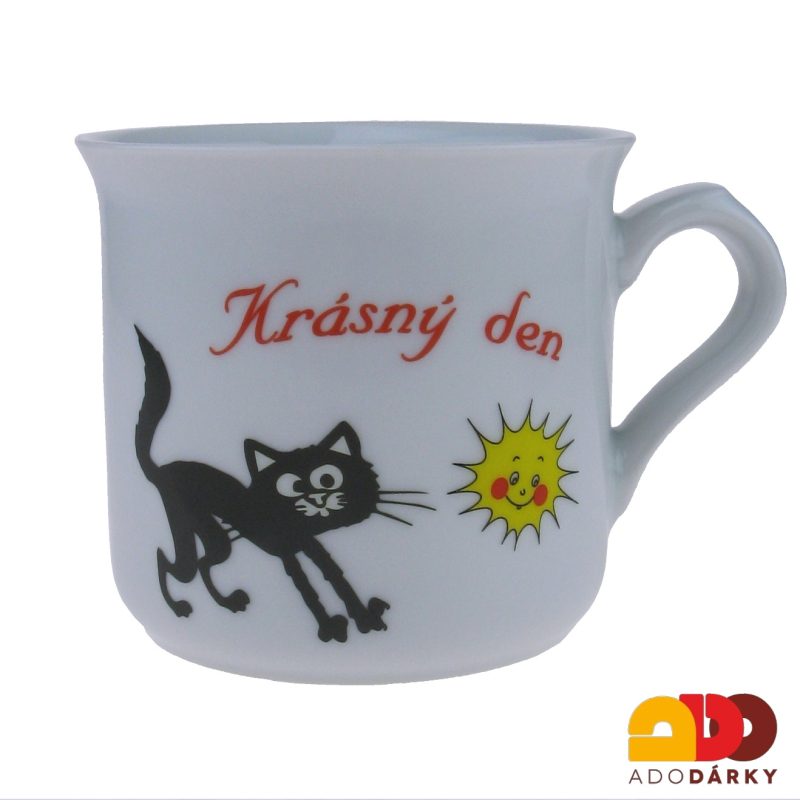 Porcelánový hrneček zdobený černobílým obrázkem kočičky a žlutým sluníčkem, doplňuje je nápis "Krásný den". Roztomilý hrneček, který by neměl chybět v žádné domácnosti kde se kočky vyskytují, nebo kde je mají rádi.
