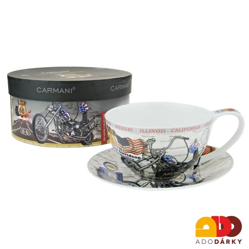 Bílý porcelánový hrnek s podšálekm a potiskem známého motorového stroje 1963 Harley Davidson je vhodným dárkem nejen pro fanouška, sběratele, ale i jen tak jako dekorace do klučičího pokoje. Navíc je dodáván ve stylové kulaté krabičce.