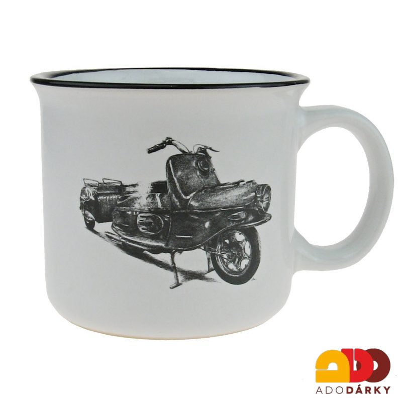 Plecháček z porcelánu. Porcelánový hrneček, který vypadá, jako tradiční plecháček a je dekorován historickým autem, můžem již říci skoro veteránem - ČZ 175 / 501 Prase.