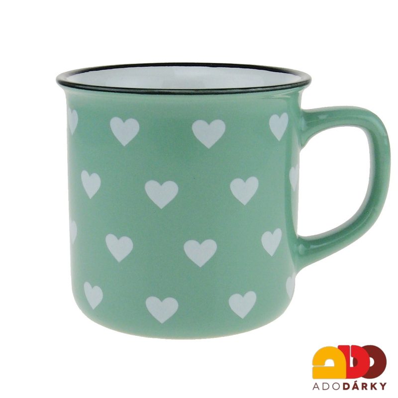 Hrnek "plecháček" světle zelený s bílými srdíčky 400 mlIhned k expedici 2 ks220 Kč/ ks182 Kč bez DPH