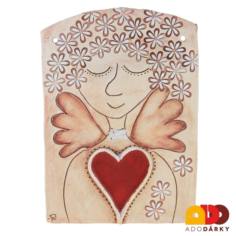Stylová keramická dekorace na zeď ve tvaru keramické kachle, s andělem se zdobnými vlasy, které navíc vévodí veliké červené srdce. Pro snadnější zavěšení se nachází na patřičných místech dva otvory.