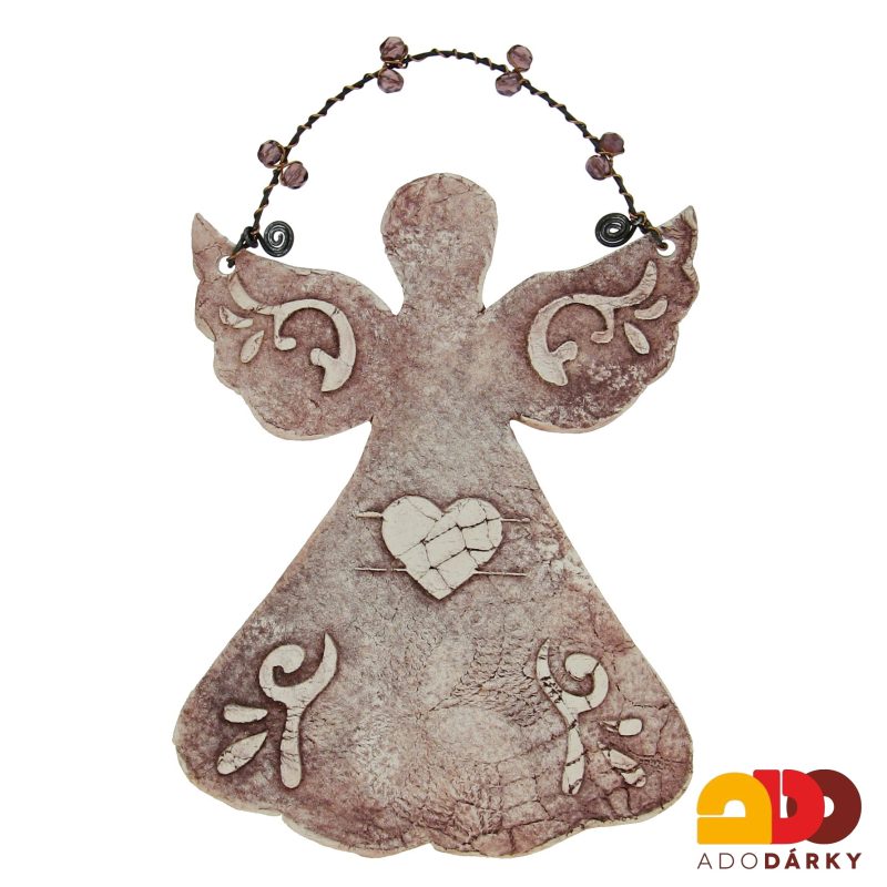 Stylová keramická dekorace na zeď ve tvaru keramického anděla, který má křídla spojená drátkem nad hlavou, na kterém jsou navlečené kamínky.