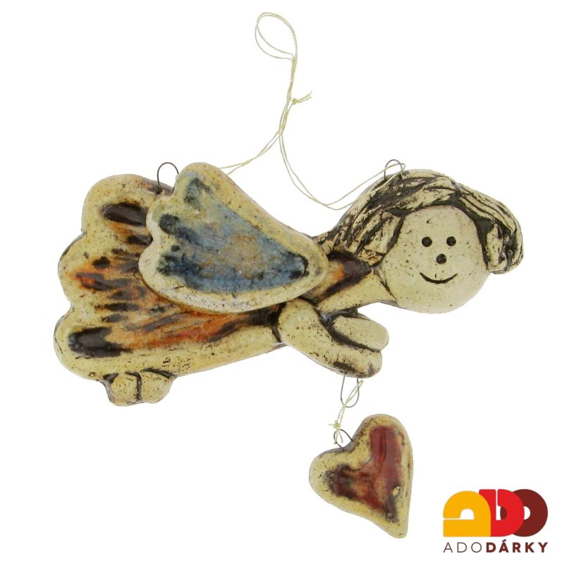 Veselá keramická dekorace v podobě andílka se srdíčkem a háčkem na zavěšení. Vyzdobte si interiér jedním z velké spousty andílků.