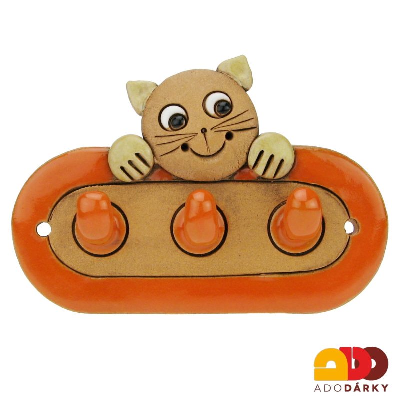 Keramická dekorace ve tvaru plastické hlavy kočky nad třemi malými věšáčky, které jsou ideální na zavěšení drobných předmětů, např. klíčů, utěrek apod. Výrobek je určen k zavěšení na zeď a v patřičném místě má otvory pro hřebíky.