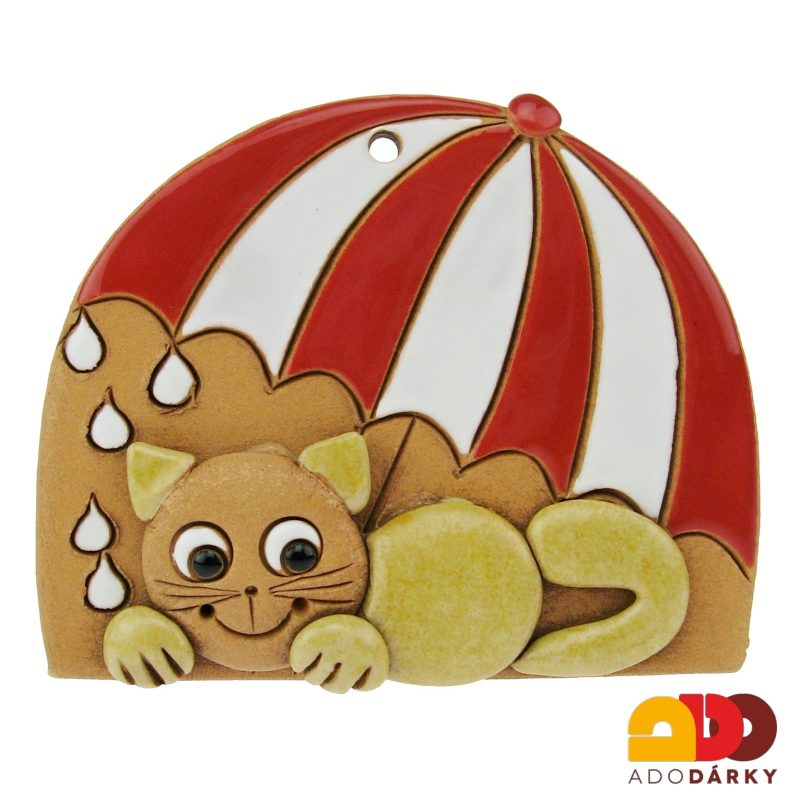 Keramická dekorace ve tvaru deštníku s kapkama deště, pod kterým leží kočička. Veselá roztomilá dekorace na zeď do každého interiéru nebo exteriéru.