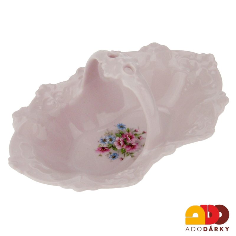 Roztomilý košík vyrobený z růžového porcelánu, dekorovaný obrázky barevných kvítků. Tento funkční předmět je produktem české porcelánky Carlsbad viva Bohemia.