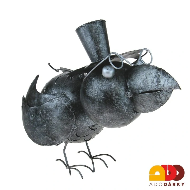 Kovový pták s velkým zobákem, kloboukem a brýlemi z černého plechu s prořezávaným tělem je vypracován tak, že je pohledový z každé strany. Pták je ve skutečnosti svícen - zezadu se část odklopí a vevnitř je místo pro čajovou svíčku, která září skrz prořezávané díry v těle ptáka. Na zadní části má kolečko s kovovou tyčkou na zavěšení. Může tedy jak stát na polici, tak i viset v prostoru. Jedná se o luxusní dekoraci do každého interiéru.