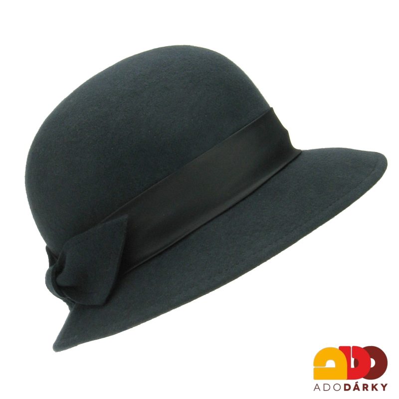 Dámský klobouk vyrobený z jemné vlněné plsti s asymetrickou krempou, zdobený stuhou a ze zadní strany mašlí ze stejného materiálu jako samotný klobouk. Nebojte se zaujmout neotřelou elegancí a doladit tak svůj dokonalý outfit ať už jdete třeba jen na procházku, nebo do divadla.