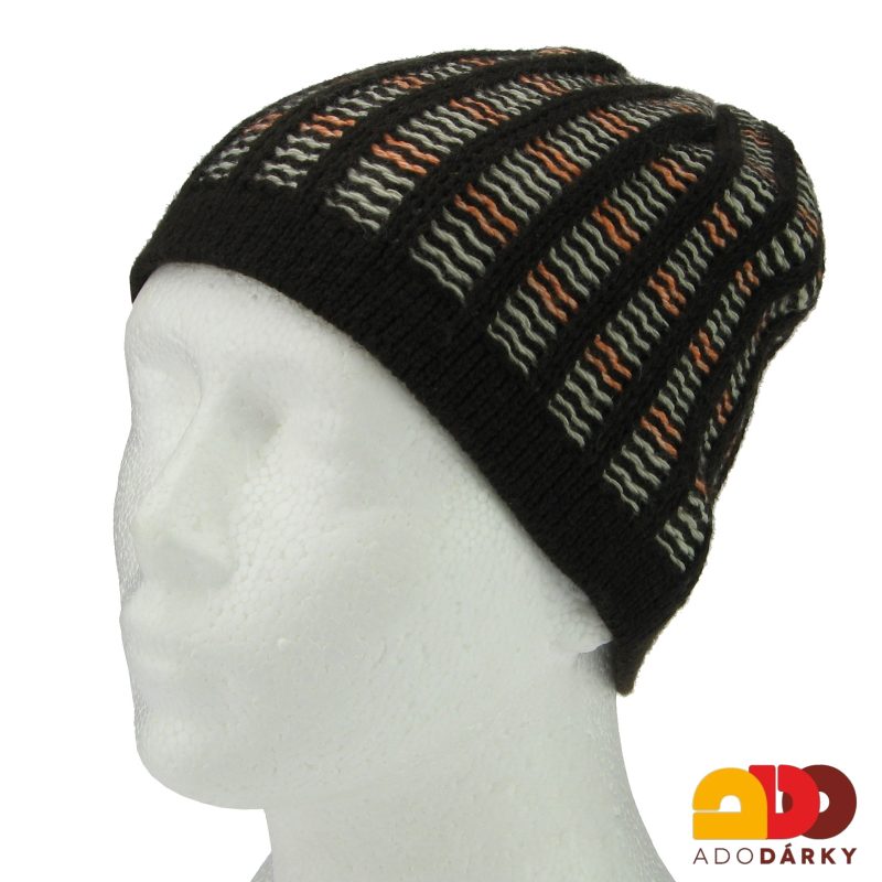 Klasická zimní pánská čepice v tmavě hnědé variantě, zdobená hlubokým výpletem.