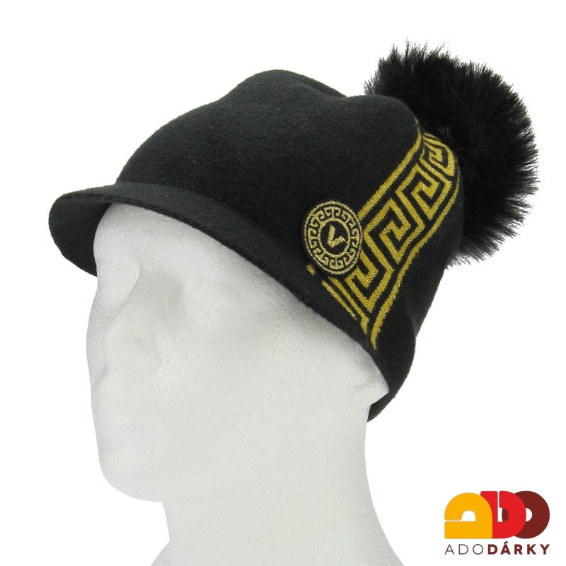 - Pletená čepice s kšiltem a bambulí černozlatá