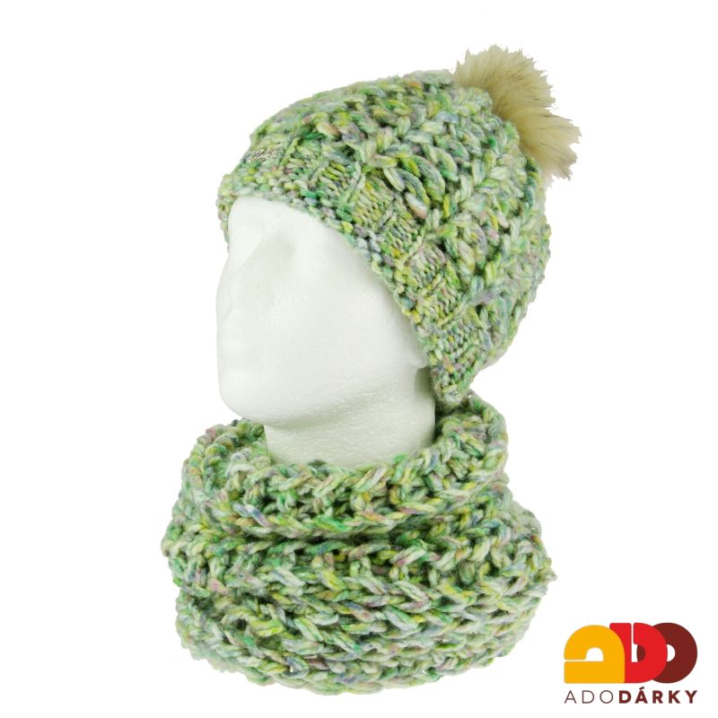 Dámská souprava pletené čepice a tunelu, to celé v melírované zelené barvě. Nedejte zimě šanci a pořiďte si trendy komplet v různých barvách.