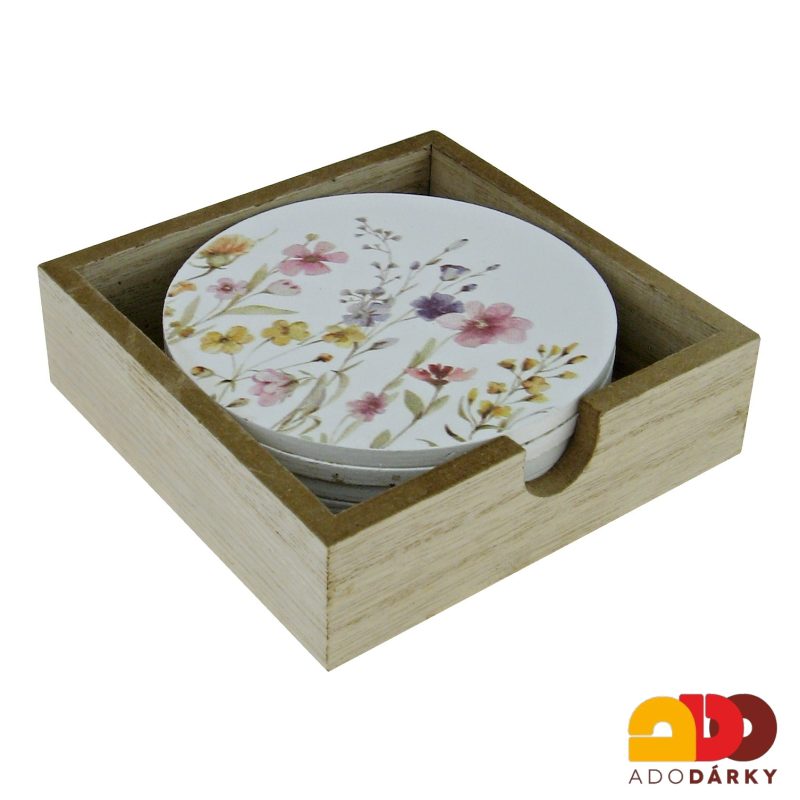 Dřevěná krabička s šesti podtácky v dekoru barevných květin. Kulaté podtácky jsou vyrobeny ze dřeva, poté potisklé a opatřené ochranou proti znehodnocení tekutinami. V sadě je šest stejných podtácků.