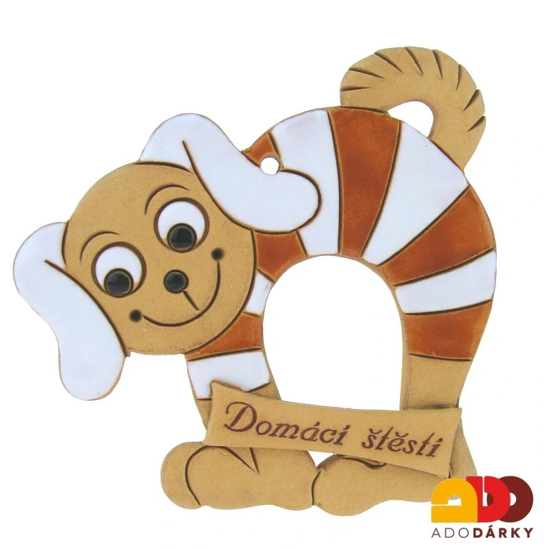 - Pruhovaný pes na zeď "Domácí štěstí" hnědo - bílý 13 cm