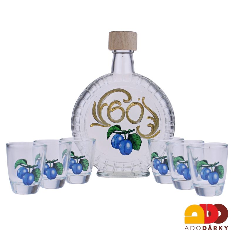 Sada 6 odlivek společně s láhví v dárkové krabici, dekorována číslicí jubilea a obrázkem švestek. Odlivky s láhví jsou dárkově zabaleny v papírovoplastové krabici. Jedná se o skvělý dárek pro kohokoliv, vhodný k jakémukoliv výročí, protože balení je skutečně luxusní.