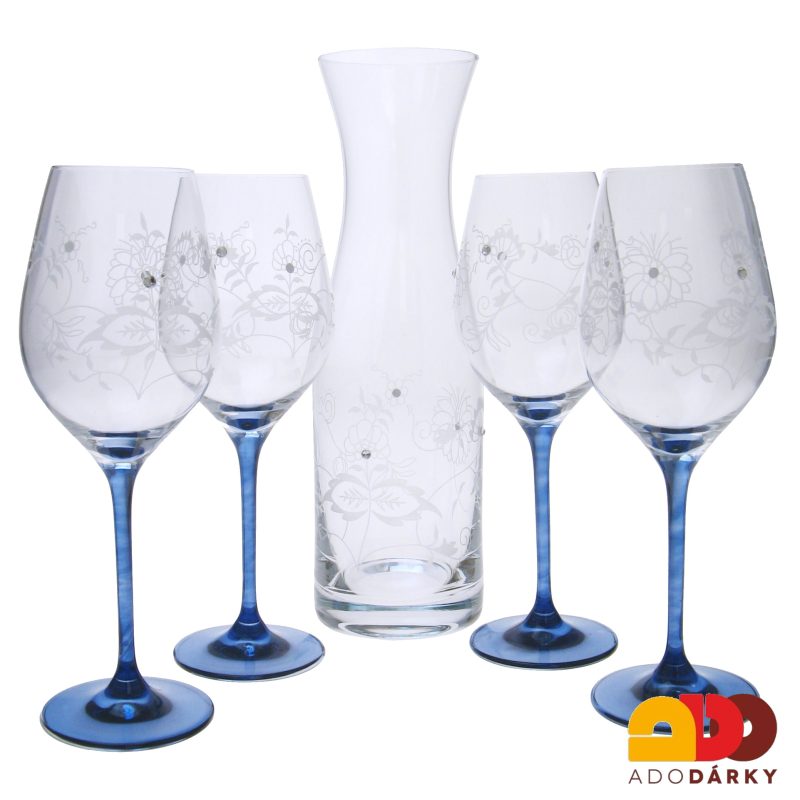 Netradiční sada karafy a čtyř sklenic s elementy Preciosa. Sklenice jsou vyrobeny z křišťálového skla, které svou kvalitou patří mezi špičku v mezinárodním srovnání a poté dekorovány broušením a skleněnými elementy Preciosa. Celá sada je zabalena v dárkové krabici.