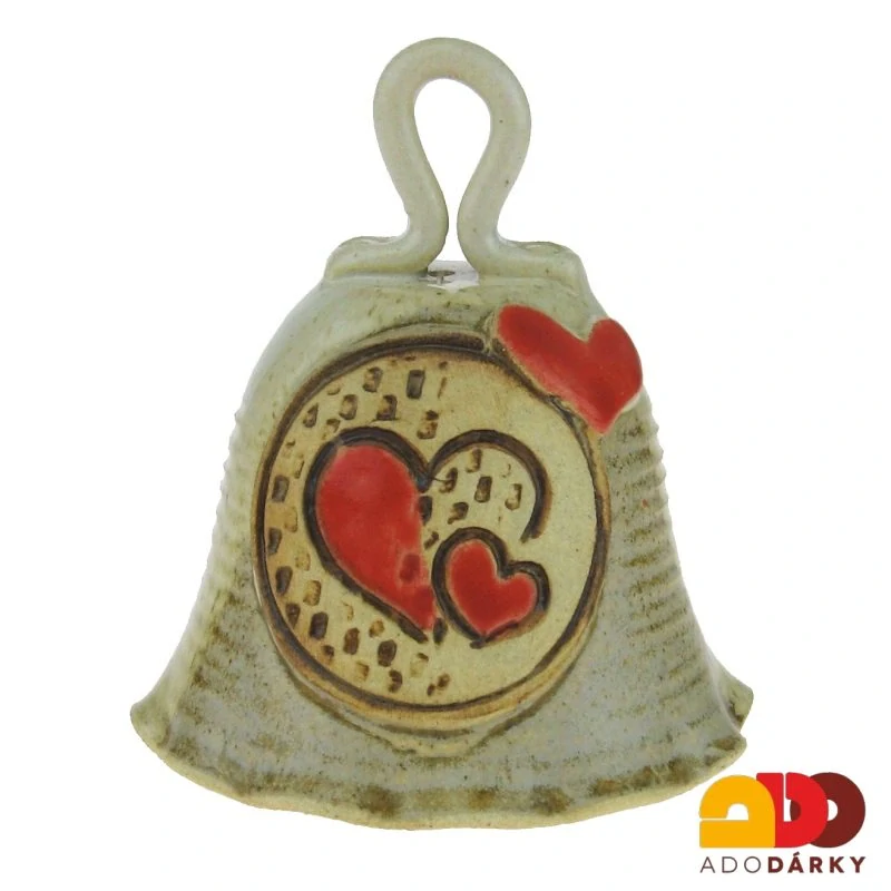 Ručně dělaný keramický zvoneček zdobený dvěma srdci. Funkční dekorace do každého interiéru. Zazvoňte si pro štěstí.