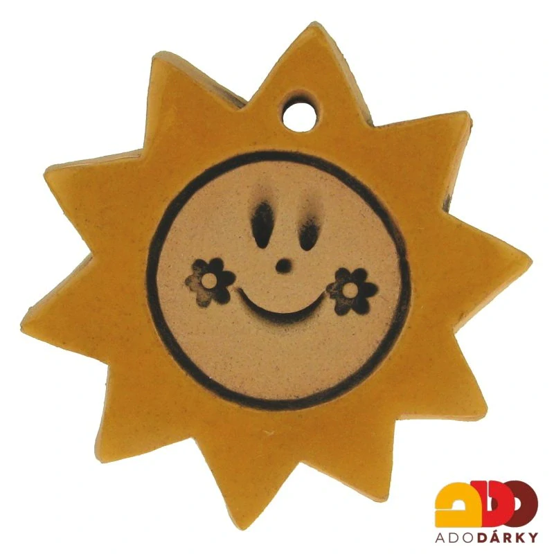 Malé keramické sluníčko s veselým úsměvem, glazované zářivýma barvama.