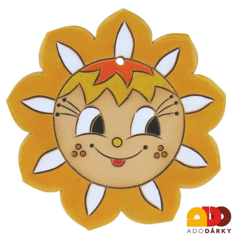 Veselá keramická dekorace sluníčka je určena k zavěšení na zeď a za tímto účelem je v ní na patřičném místě otvor pro hřebík. Rozjasněte svůj pokoj touto roztomilou dekorací.