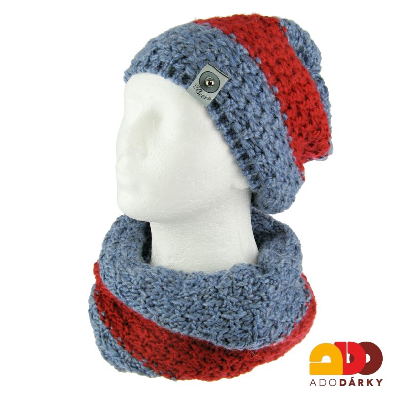 - Souprava modréhočerveného pleteného tunelu a čepice