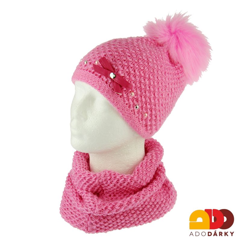 Dámská souprava pletené čepice s bambulí a tunelem, to celé v růžové barvě. Nedejte zimě šanci a pořiďte si trendy komplet v různých barvách.