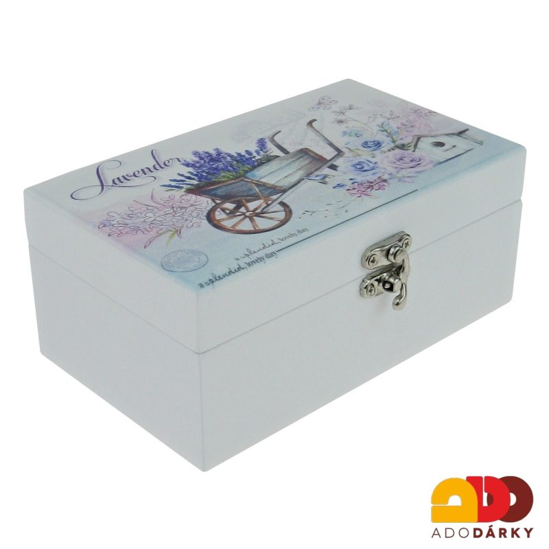 Kvalitní dřevěná šperkovnice na nejrůznější druhy klenotů, po odklopení horního víka se objeví zrcátko plus dva oddělené oddíly na šperky. Na vnější straně motivy ve stylu motivů Provence - kolečka s levandulemi.
