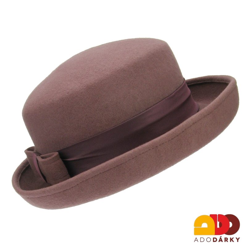 - Starorůžový plstěný klobouk s rovnou střechou a mašlí