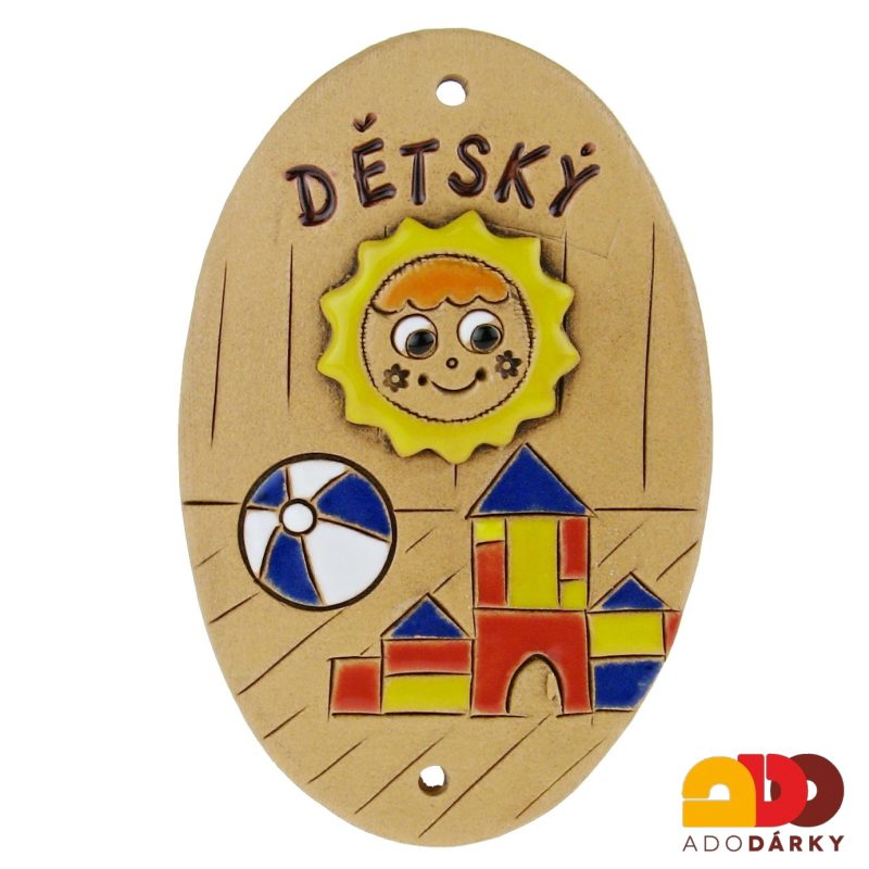 Štítek na dveře pokoje samozřejmě nemusí viset přímo na dveřích, ale třeba i vedle na zdi... Nahoře a dole jsou dírky pro hřebíčky nebo šroubky, popřípadě je možné štítek přilepit lepidlem. Štítek je z keramiky a je glazován veselými barvami - jedná se o ruční práci a každý kus je originál.