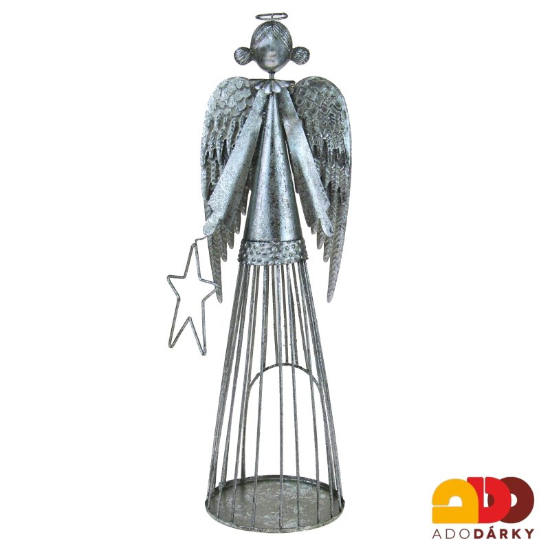 Plechová plastika stříbrného anděla s hvězdičkou v ruce. Dekorace je vyrobena z plechů různé tloušťky a poté svařována. Ze spodní strany má anděl místo na jednu čajovou svíci. Rozžehněte svíčku a nechte se potěšit světlem svítícími skrze andílka. Zajímavá dekorace do každého moderního bytu.