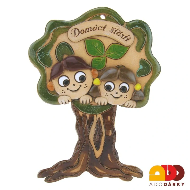 Keramický strom, zpoza kmene vykukují hlavy kluka a holky a v koruně stromu je nápis "Domácí štěstí". Vše je vyvedeno v jasných barvách a jedná se o vhodný doplněk či dárek, který prozáří každý pokoj. Pro snadné zavěšení je v patřičném místě otvor pro hřebík.