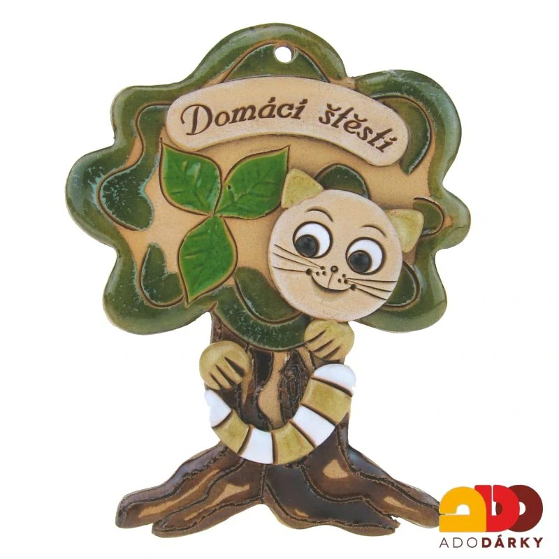 Keramický strom, pod nímž leží kočka a v koruně stromu je nápis "Domácí štěstí". Vše je vyvedeno v jasných barvách a jedná se o vhodný doplněk či dárek, který prozáří každý pokoj. Pro snadné zavěšení je v patřičném místě otvor pro hřebík.