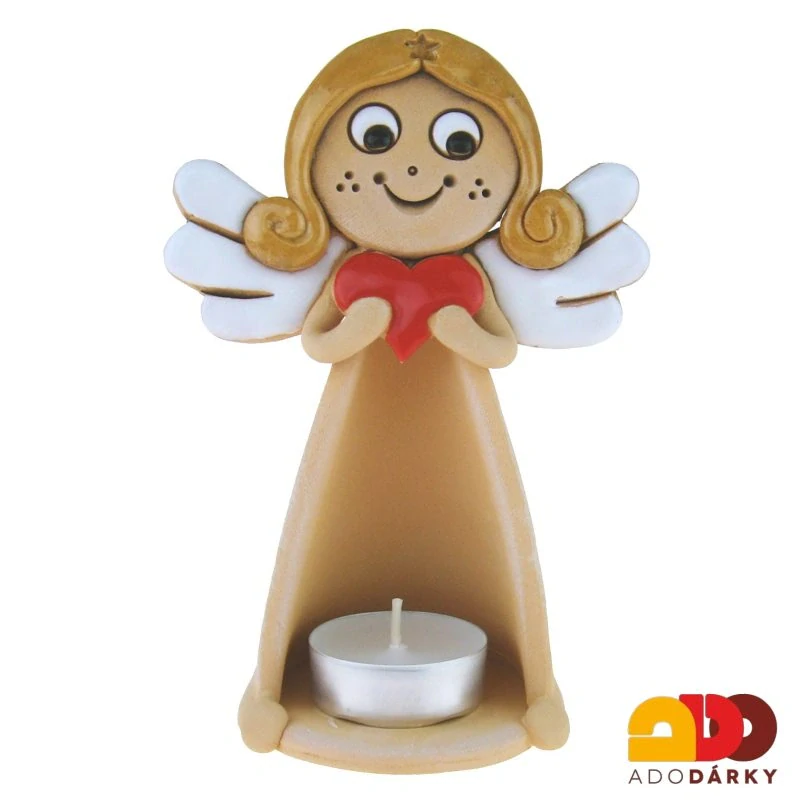 Ručně dělaný keramický svícen v podobě anděla držícího červené srdíčko. Netradiční dárek, či milá ozdoba každé domácnosti. Svícen je koncipován na jednu čajovou svíčku, která je součástí balení.