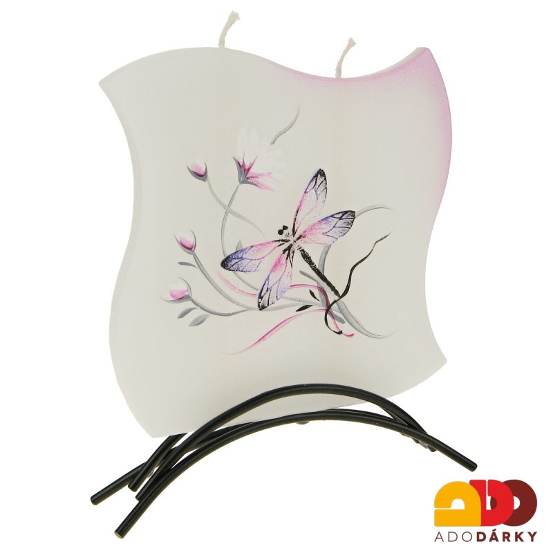 Svíčka 2 knoty vážka fialovo - růžová + kovový stojánek