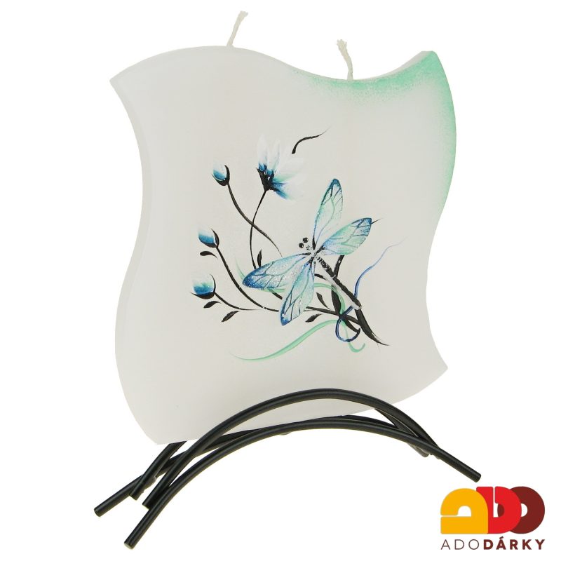 Svíčka 2 knoty vážka modro - zelená + kovový stojánek
