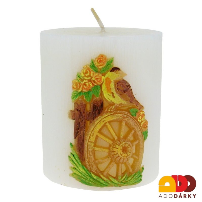Kvalitní svíčka ve tvaru oválu s plastickou voskovou dekorací ptáčka sedícího na kole. Svíčka hoří rovnoměrně a po stranách neteče. Ideální k navození té správné pohodové atmosféry.