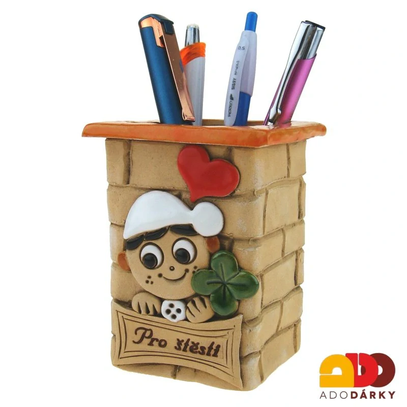 Tužkovník z keramiky vypadá jako komín a je na něm plasticky vyveden kominík pro štěstí. Od teď budete mít tužky na stole dozajista v pořádku.