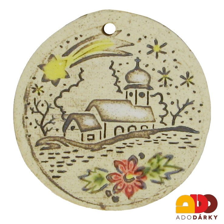 Vánoční kulatá keramická dekorace na zeď, glazována veselými barvami, na které je vánoční vesnička s Betlémskou hvězdou. Udělejte si radost touto roztomilou miniaturou, která Vám přinese spoustu radosti.
