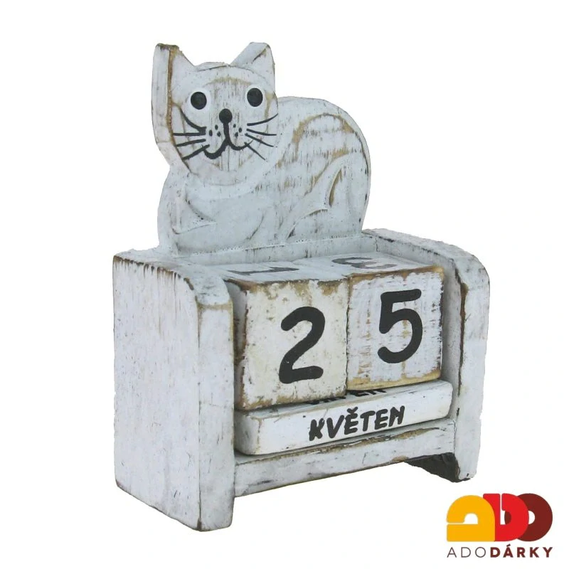 Věčný kalendář s kočkou, na kterém s pomocí tří kvádrů a dvou kostek nastavíte libovolné datum. Z půlky dekorační, ale rozhodně funkčí věc do Vaší domácnosti. Měsíce jsou samozřejmě uvedeny česky.