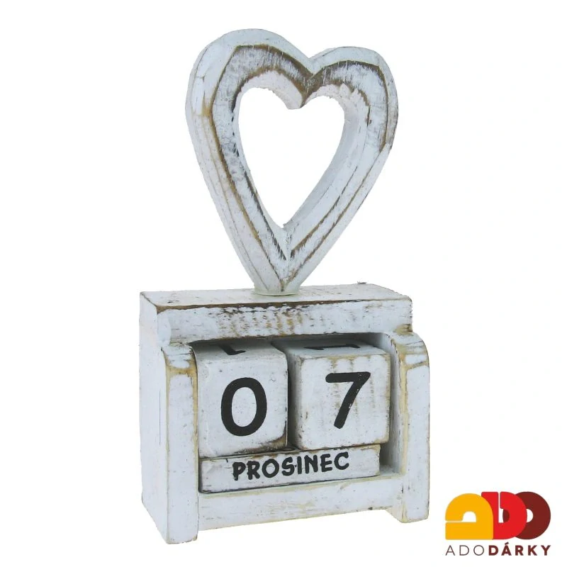 Věčný kalendář se srdcem, na kterém s pomocí tří kvádrů a dvou kostek nastavíte libovolné datum. Z půlky dekorační, ale rozhodně funkčí věc do Vaší domácnosti. Měsíce jsou samozřejmě uvedeny česky.