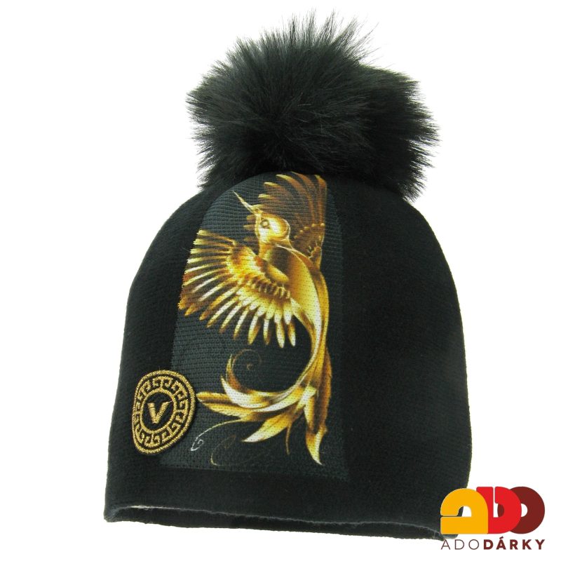 Vlněná zimní čepice černé barvy s bambulí a potiskem zlatého ptáka Fénixe z přední strany. Moderní design a nápaditý potisk dělají z čepice vhodný doplněk téměř ke každému outfitu.