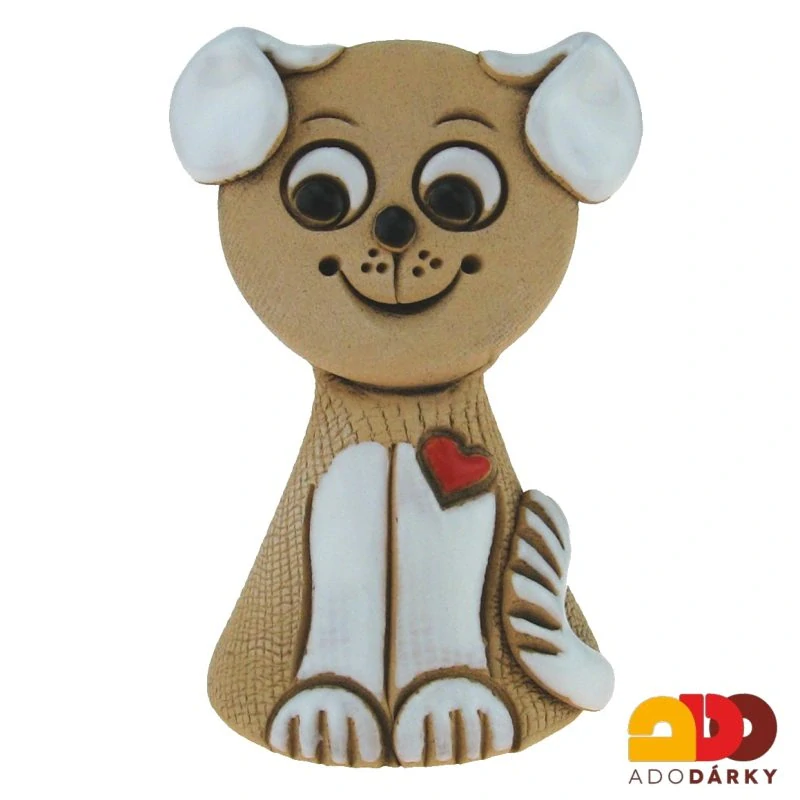 Roztomilý keramický zvoneček vymodelovaný do tvaru pejska s ušima a ocáskem ozdobený srdíčkem. Ideální dárek jen tak pro radost, který obdarovanému přinese po zazvonění spoustu štěstí.